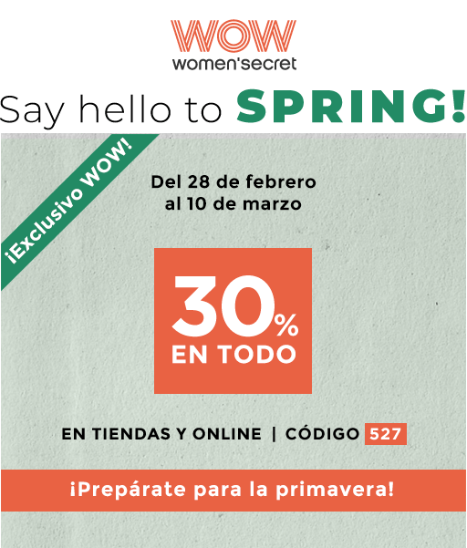 * 30% de descuento en todo, válido exclusivamente para socios del 28 de febrero al 10 de marzo de 2019 en las tiendas Women'secret de España y en la tienda online womensecret.com de España. No acumulable a otras promociones, ofertas o descuentos, ni aplicable a operaciones que incluyan tarjeta regalo, ni en cambios. Para el uso del descuento en tienda física será necesario presentar el email (impreso o en tu Smartphone) e identificarte como socio WOW y en tienda online tienes que estar identificado como socio del Club WOW e introducir el código 527 al finalizar tu compra. Esta promoción es acumulable a tu WowMoney.